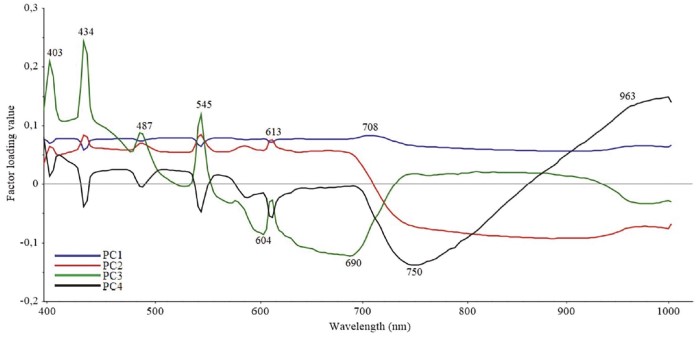 По результатам обработки матрицы данных выделено первые четыре главные компоненты (ГК): первая, вторая, третья и четвертая ГК (PC – principal component), которые объясняют 99.5% от общей дисперсии (70.3%, 27.0%, 1.4%, 0.8% соответственно). Значение факторных нагрузок коэффициентов отражения на длинах волн спектра по четырем ГК представлена на Рисунке 2. Проведена интерпретация с первой по четвертую ГК по знаку (+/–) и по значению факторных нагрузок коэффициентов отражения на длинах волн спектра.