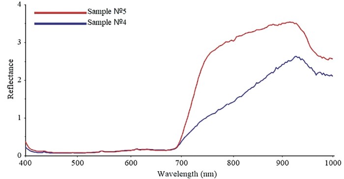 Согласно опубликованным работам в VIS‑области присутствуют полосы колебаний C-H при 740 нм и широкая полоса третьего обертона колебаний C-H, CH2, и CH3 при 840 нм, интенсивность которых коррелирует с содержанием сухого вещества. Следовательно, более низкое отражение в NIR‑области при 740 и 840 нм характерное для образца № 4, соответствует меньшему содержанию влаги и большему содержанию сухого вещества.