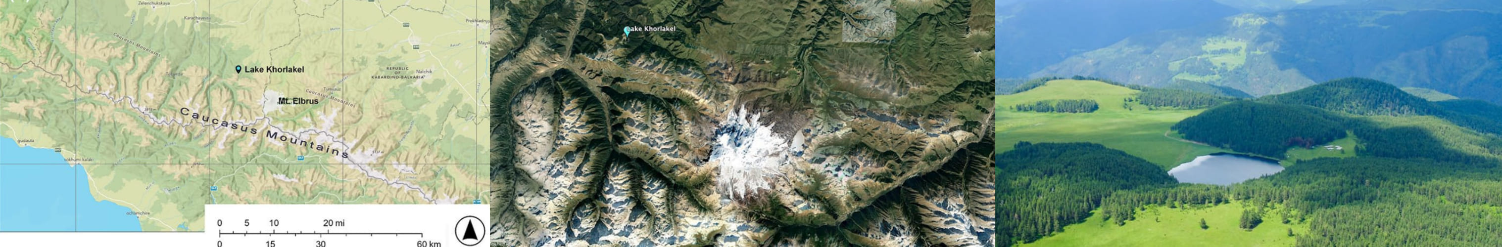 Рисунок 1 - Карта района исследования (предоставлено: ESRI). Рисунок 2 - Аэрофотоснимок озера Хорлакел и его окрестностей (предоставлено: Google). Рисунок 3 - Фотография озера и водосборной площади (предоставлено: М. Александрин).