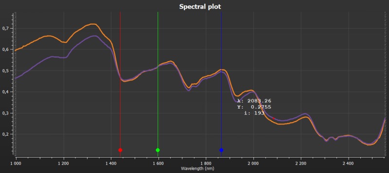Камера Specim FX17 зафиксировала более выраженные спектральные характеристики, особенно в диапазонах 1200, 1430 и 1700 нм. Наличие этих пиков, соответствующих спектральным особенностям кофе, повысило способность камеры различать примеси от кофейных зерен.