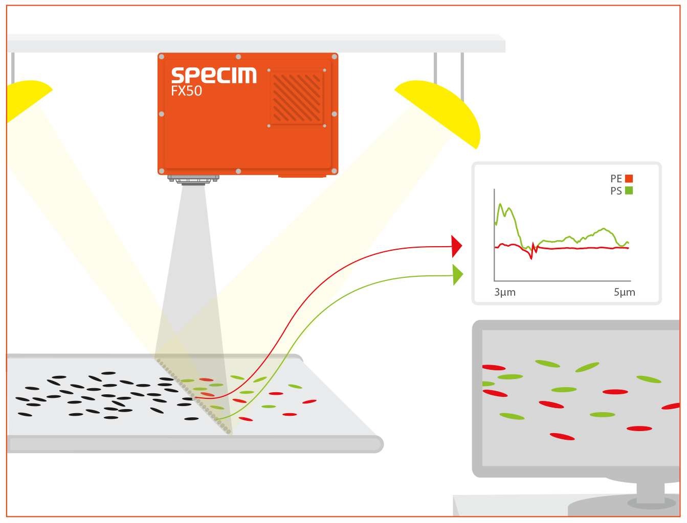Гиперспектральная камера Specim FX50 представляет собой эффективное решение для сортировки черного пластика. Она является единственной гиперспектральной камерой на рынке, которая охватывает весь средневолновой инфракрасный (MWIR) спектральный диапазон от 2,7 до 5,3 мкм, что необходимо для точной сортировки черного пластика.