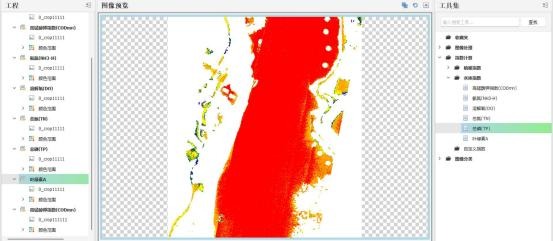 - Анализ общего азота: (чем выше интенсивность цвета, тем выше относительная концентрация) Повышенное содержание наблюдается на границе водоема и во внешнем речном канале, а правая часть изображения характеризуется низким содержанием, отображаемым зеленым цветом.