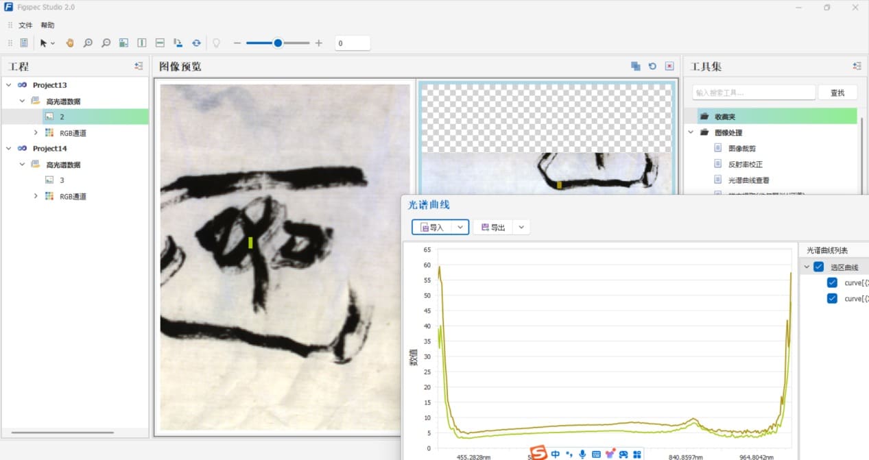 Подлинные и печатные образцы каллиграфии сканируются внешней гиперспектральной камерой в диапазоне длин волн от 400 до 1000 нм для анализа криволинейных характеристик.