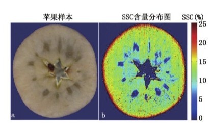 Рисунок 7 - a: Образец яблока; b: Результат отображения SSC (содержания растворимых сухих веществ), где участки яблока, находящиеся ближе к кожуре, имеют более высокие значения SSC по сравнению с центральными частями.