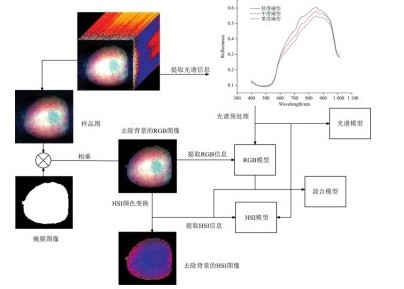 Разрешение изображений мушмулы, полученных гиперспектральной камерой, составляет 960x366 пикселей. Изображения содержат много фона конвейерной ленты, который не является чисто черным и имеет серые значения из-за освещения галогеновой лампой. В качестве переменных для моделирования и анализа использовались средние значения RGB-каналов и модели HSI в сочетании со спектральной информацией. Для отделения изображения мушмулы от фона использовался метод пороговой сегментации. На основе полученных граничных значений применялся метод маскирования, позволяющий сохранить значения серого для переднего плана (мушмулы) для последующих вычислений. Затем цветные и спектральные характеристики были объединены для моделирования и анализа. Общий процесс показан на Рисунке 5. Извлеченные спектральные характеристики, характеристики RGB-изображения и характеристики HSI-изображения использовались для построения четырех моделей степени повреждения мушмулы: модель на основе спектральных характеристик, модель на основе спектральных характеристик в сочетании с характеристиками RGB-изображения, модель на основе спектральных характеристик в сочетании с характеристиками HSI-изображения и модель на основе спектральных характеристик в сочетании со смешанными характеристиками изображения.