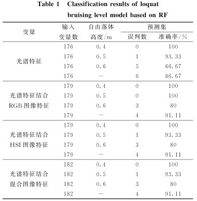Алгоритм RF, известный своей высокой точностью и обобщающей способностью, был использован для классификации степени повреждения мушмулы. Результаты (Таблица 1) показали, что точность классификации на основе только спектральных данных составила 86.67%. Интеграция цветовых характеристик (RGB или HSI) значительно улучшила точность до 91.11%. Дальнейшее объединение RGB и HSI характеристик не привело к дополнительному увеличению точности. Анализ ошибок классификации показал, что основное улучшение точности связано с более точной идентификацией плодов с сильными повреждениями.