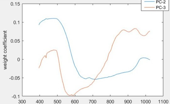 Для выделения характерных длин волн были проанализированы векторы признаков для PC-2 и PC-3. На основе анализа весовых коэффициентов для каждой длины волны были построены графики, представленные на Рисунке 4.5. В качестве характерных длин волн рассматривались те, что соответствовали пикам и впадинам на графиках весовых коэффициентов, поскольку именно они несут наибольшую информацию. Для PC-2 были выделены длины волн 500 нм, 680 нм и 980 нм, а для PC-3 - 500 нм, 580 нм, 850 нм и 930 нм. В конечном итоге, в качестве характерных были выбраны следующие длины волн: 500 нм, 580 нм, 680 нм, 850 нм, 930 нм и 980 нм.