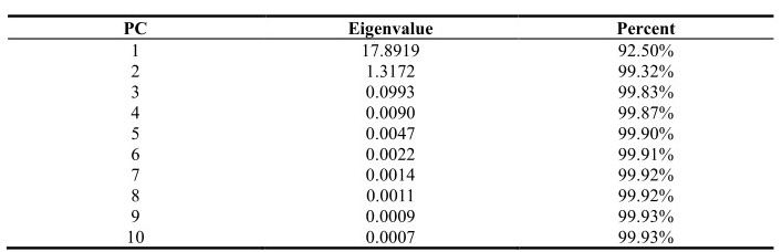 Для визуализации и анализа использовалось программное обеспечение ENVI. Теоретически, каждое изображение, соответствующее определенной главной компоненте, формируется в результате линейного преобразования цифровой матрицы исходных данных. С помощью программного обеспечения ENVI были рассчитаны ковариации, коэффициенты корреляции и собственные векторы для каждой главной компоненты. В основном, PC-1 содержит наибольший объем исходной информации, а изображения первых четырех главных компонент представлены в соответствующем разделе.