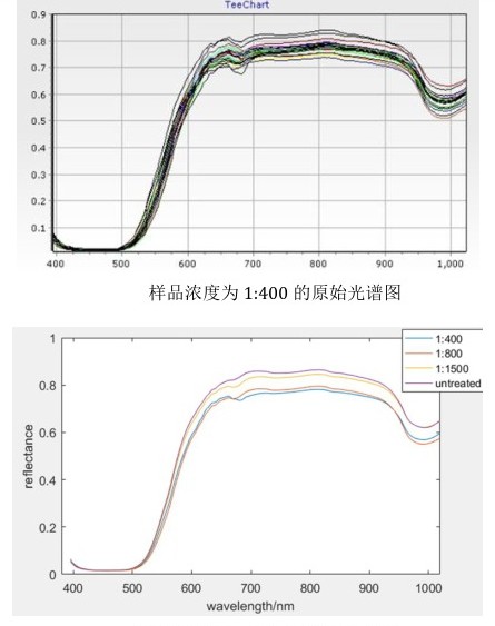 Для каждого типа образцов было получено 20 спектров. В качестве примера, на рисунке представлен типичный спектр образца, обработанного раствором с концентрацией 1:400. Далее, для каждой группы образцов были рассчитаны средние спектральные кривые, полученные путем усреднения спектров всех 20 образцов с применением стандартного нормального преобразования (SNV) для компенсации рассеивания света.