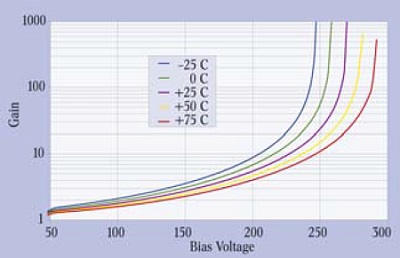 Рис. 2. Типовая зависимость коэффициента усиления от рабочего напряжения для кремниевых лавинных фотодиодов при разных температурах, где активная область D = 500 мкм.