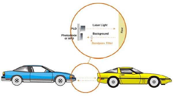 Рис. 3. Измерение расстояния и относительной скорости в автомобильной промышленности с использованием импульсных лазерных диодов и лавинных фотодиодов.