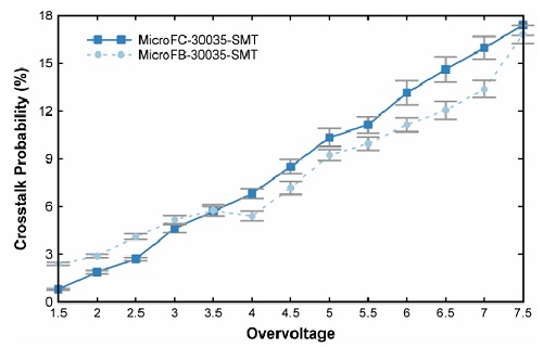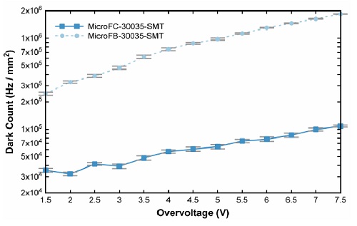 На рисунке 2 сравниваются скорости темнового счета (англ. Dark Count Rate (DCR)) Si-ФЭУ MicroFB-30035-SMT и MicroFC-30035-SMT.