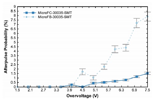 Из графиков видно, что события остаточных импульсов регистрируются при значении перенапряжения выше 4В. Кроме того стоит отметить, что детекторы С-серии SensL обладают намного более низкой вероятностью возникновения остаточных импульсов по сравнению с детекторами предыдущей В-серии. Предположительно снижение вероятности возникновения остаточных импульсов, также как и в случае снижения скорости темнового счета, достигается за счет уменьшения количества дефектов, возникающих на этапе производства.