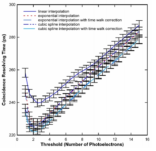 Как видно из рисунка оптимальное (минимальное) значение CRT наблюдается при уровне срабатывания триггера по амплитуде равной двум единичным фотоэлектронам. При высоких уровнях срабатывания триггера, благодаря устранению корреляции между разницей во времени и разницей в величине зарядов частиц, также известной как «уход показаний моментов времени», достигается уменьшение значения CRT. Использование линейной, экспоненциальной и кубической схем сплайн-интерполяций положительно сказывается на значениях разницы во временных метках событий, представленных на рисунке. Наибольший эффект был получен при переходе от линейной сплайн-интерполяции к экспоненциальной, при этом достигалось уменьшение CRT с 240 пс до 225 пс; дальнейшее уменьшение CRT до 222 пс может быть достигнуто с использованием кубической сплайн-интерполяции. При значениях порога срабатывания триггера, превышающего в 3 раза амплитуду сигнала соответствующего одному фотоэлектрону, кривые полученные с использованием экспоненциальной и кубической сплайн-интерполяций пересекаются.