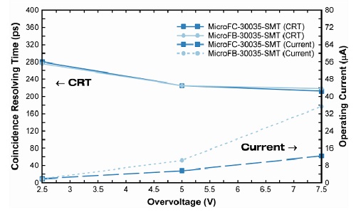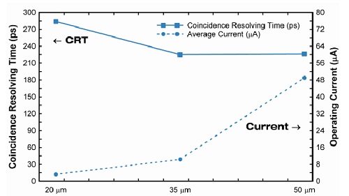 Измерения CRT использовались для определения оптимального размера микроячейки Si-ФЭУ для применения во времяпролетной позитронно-эмиссионной томографии. На рисунке 6 показана зависимость оптимальных значений CRT и рабочего тока (при использовании экспоненциальной интерполяции и коррекции ухода показаний моментов времени при перенапряжении 5В) двух Si-ФЭУ B-серии SensL с размером активной области 3х3 мм2, расположенных напротив друг друга; на рисунке приведены показания для Si-ФЭУ с размерами микроячеек 20 мкм, 35 мкм и 50 мкм.