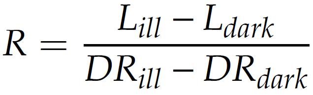 где Lill и Ldark- измерения яркости с и без освещения соответственно, а DRill и DRdark спектры диффузного отражателя при одинаковых условиях. Это требует сбора как минимум двух наборов данных на анализ (темных и освещенных), где диффузный отражатель должен находиться в пределах сцены для каждого набора данных. Наборы изображений для каждого условия освещения сшиваются для двух отдельных мозаик изображений, которые впоследствии совместно регистрируются и вычитаются друг из друга. Спектры Drill и DRdark рассчитываются как среднее значение по отраженному диффузному отражателю.
