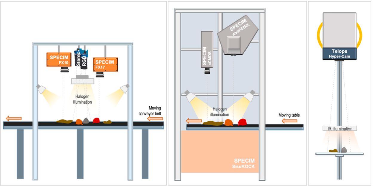 Камера Specim FX10, FX17 и две камеры Teledyne Dalsa RGB (отсюда FX10, FX17 и RGB) используются в специальной установке над конвейерной лентой, но также могут быть установлены в системе сканирования SisuRock. В обеих установках равномерное освещение соответствующей области изображения достигается двумя (SisuRock) или четырьмя (установка конвейерной ленты) широкополосными кварцево-вольфрамовыми галогенными лампами (без защитного стеклянного покрытия), покрывающими диапазон VNIR и SWIR. Для всех линейных сканеров изображения создаются путем сканирования образцов.