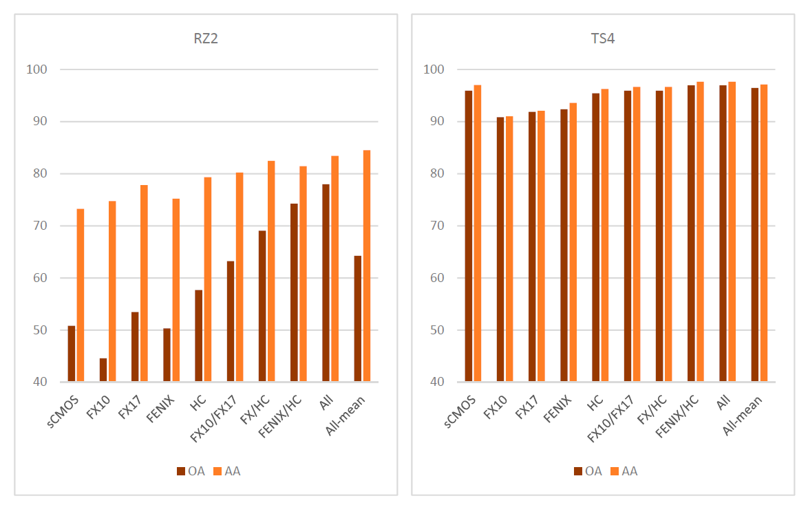 Как и в примере RZ2, слияние спектрально значимых данных с пространственно разрешенными изображениями позволило отобразить объекты и структуры, лежащие в субпиксельной шкале более грубого разрешенного ввода. Таким образом, слияние данных FENIX с более точными данными Telops Hyper-Cam позволяет четко разделить жилы, ширина которых составляет всего половину размера пикселя FENIX. Как и ожидалось, дальнейшее включение пространственно высоко разрешенных данных VNIR и более низких значений SWIR (FX и sCMOS) позволило достичь высочайшей точности классификации среди всех тестов. Визуальная проверка также подтверждает его классификацию как общий лучший результат.