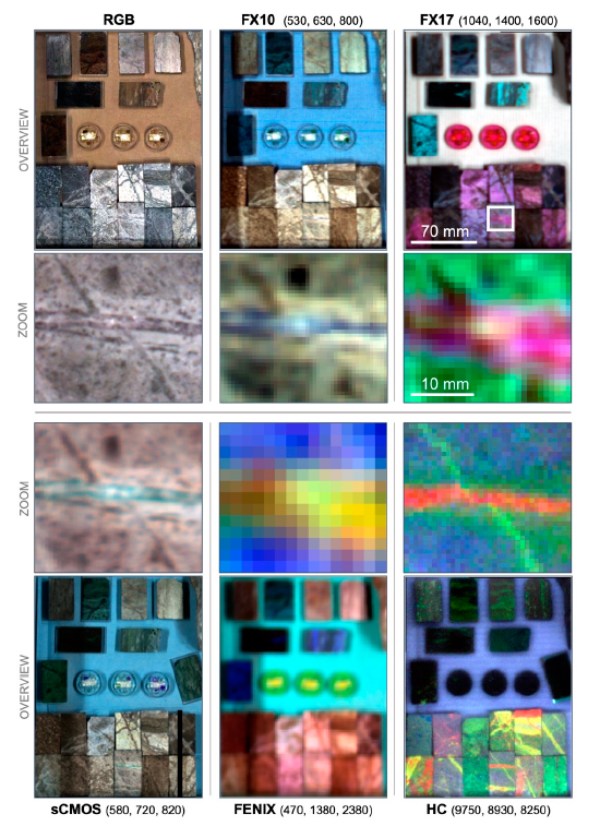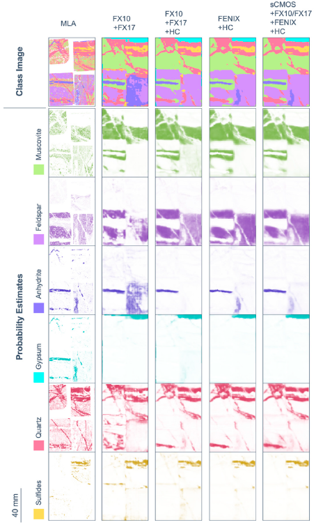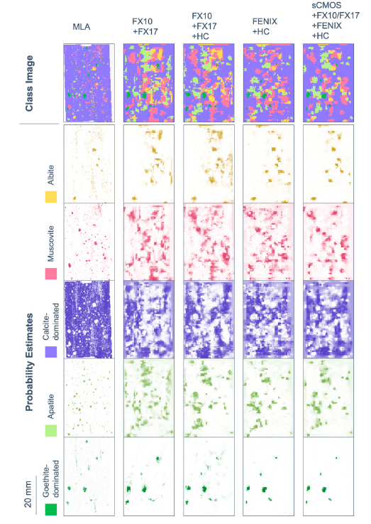 Камера FENIX имеет самое грубое спектральное разрешение; однако он предлагает самый широкий спектральный диапазон и общее достаточное спектральное качество с высоким отношением сигнал/шум. Это единственная испытанная гиперспектральная камера, охватывающяя диапазон длин волн от 2000 до 2500 нм, который необходим для обнаружения минералов, содержащих группы AlOH, MgOH, FeOH или CO3, по их колебательным обертонам. FENIX в основном не способен пространственно разрешать узкие вены или отдельные минеральные зерна. Следовательно, тонкодисперсные минералы, представляющие интерес, могут быть не обнаружены, если интенсивности их спектральных характеристик не превышают уровень шума в спектре смешанного пикселя. Напротив, FENIX может предоставить обзор общего состава образца, выделить литологические зоны или крупные вены. Сбор и предварительная обработка данных бывают быстрыми и понятными и могут охватывать большие партии образцов в разумные сроки, что делает его идеальным инструментом для сканирования ядра бурового крена. Показано, что комбинация с камерой с более высоким пространственным разрешением частично преодолевает его пространственные ограничения и обеспечивает точную классификацию объектов с субпиксельным размером.