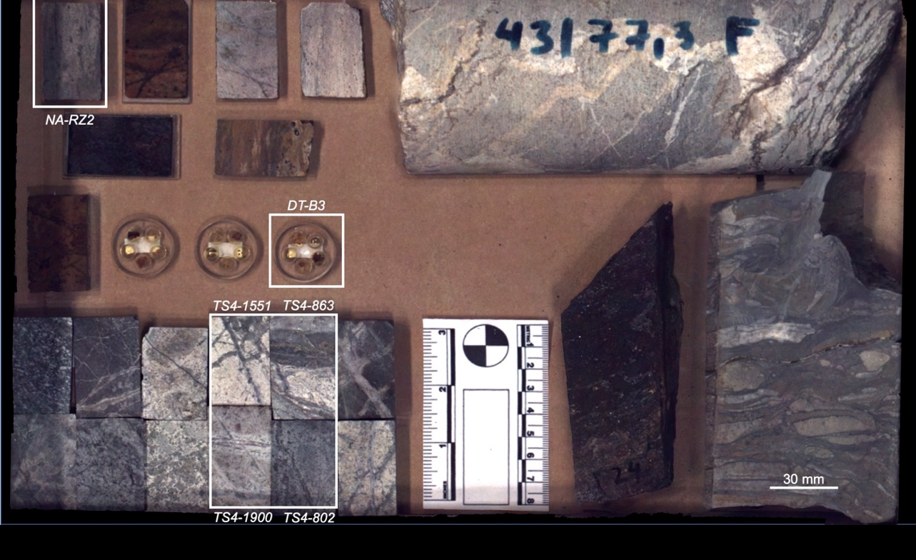 Рис. 2. Изображение формата RGB анализируемых образцов, включая толстые и тонкие срезы, буровые керны, образец горной породы размером около 75x100x25 мм и редкоземельные минералы, залитые эпоксидной смолой. Образцы, подробно проанализированные и помечены.