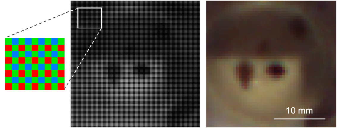 Рис. 3. Слева: схемат RGB матрицы Байера; посередине: примерное RGB изображение в байере, и справа: соответствующее RGB изображение после дебайеризации (восстановление данных из мозаичного цифрового изображения, полученного через фильтр Байера).