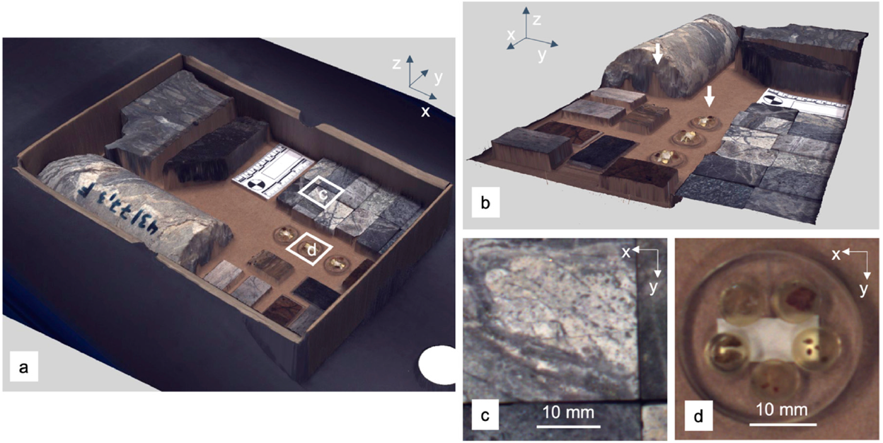 Исследована партия образцов с различными спектральными, текстурными и пространственными характеристиками. Образцы состоят из нескольких срезанных пород и толстых срезов (толщиной ~ 2 мм) из различных месторождений полезных ископаемых, двух половин бурового керна (режущая поверхность, одна вверх и одна вниз), образец горной породы размером около 75x100x25 мм, а также трех дисков из эпоксидной смолы с минералами, содержащими редкоземельные элементы (РЗЭ), из важных месторождений по всему миру (см. рис.2).
