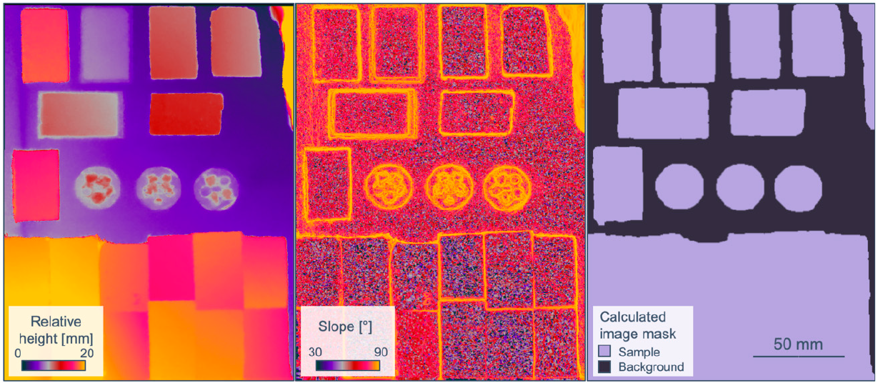 Чтобы все учесть и компенсировать все это, мы предлагаем выборку фонового разделения на основе контуров высот и значений. Оба могут быть получены из данных RGB высокого разрешения. В текущей ситуации сначала рассчитывается карта наклона из ранее предоставленной фотограмметрической цифровой модели поверхности, указывающей на резкие изменения в высоте из-за очевидных образцов по увеличенными значениями (Рис. 5, посередине). Эти изменения могут быть извлечены как контуры, например, с использованием подхода Suzuki и Abe [34], который реализован в наборе инструментов OpenCV [35]. Затем средние значения высоты в пределах каждого контура сравниваются с ожидаемым фоновым уровнем. Всякий раз, когда это значение превышает определенную пороговую высоту, конкретный контур идентифицируется как образец. При таком подходе обнаруживаются даже прозрачные, плоские или соседние образцы, в то время как артефакты высот или маркеры в областях, не являющихся образцами, игнорируются (рис. 5, справа). Затем конечная маска пересэмплируется и применяется к любому совместно зарегистрированному набору данных.