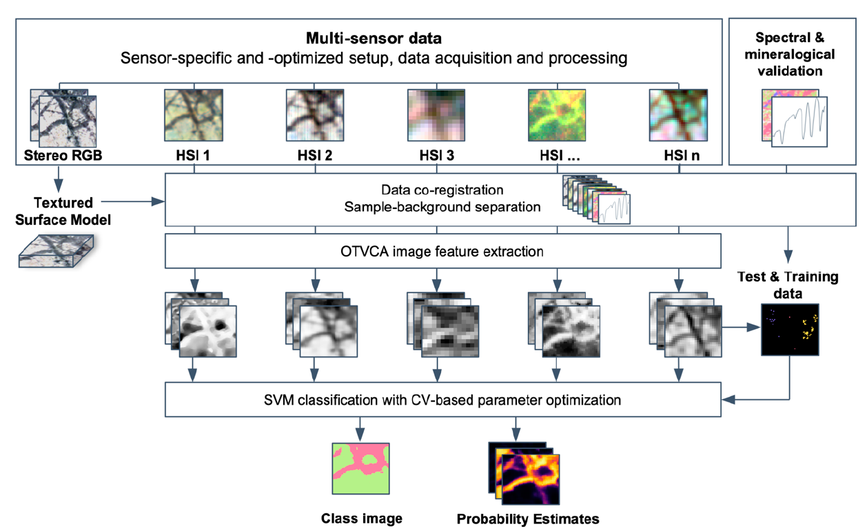 Эти очевидные пробелы в лабораторной мультисенсорной интеграции гиперспектральных изображений побудили авторов данной статьи к исследованию; (1) интегрируемость и значимость мультисенсорных наборов данных, полученных в различных экспериментальных установках, для достижения оптимальных условий; (2) объединение мультисенсорных данных для более надежного обнаружения минералов с использованием сложных алгоритмов машинного обучения; (3) оценка используемых камер для применения в поиске полезных ископаемых. Были получены изображения набора геологических образцов с различной минералогией, используя стереоизображения RGB, а также пять гиперспектральных камер с различными характеристиками с точки зрения конструкции сенсора, скорости сбора данных, пространственного разрешения и спектрального диапазона. Для проверки была получена минералогическая информация в виде карт на базе СЭМ и измерение спектральных точек, охватывающих весь электромагнитный спектр в диапазоне длин волн от 0.35 до 15.39 мкм. Были совместно зарегистрированы наборы данных с использованием автоматически извлеченных ключевых точек. Была рассчитана модель поверхности на основе стерео RGB-данных и извлечена информация о высоте и контуре, чтобы разделить образцы пикселей и фон во всех наборах данных. Использовался метод извлечения признаков ортогонального общего вариационного компонента (OTVCA), чтобы выбрать от пяти до семи наиболее вариативных элементов в каждом наборе данных, уменьшая общую размерность и размер данных. Этот шаг необходим не только для сокращения общего времени обработки и избыточности данных, но также для устранения «явления Хьюза» [29], также известного как «проклятие размерности». Это относится к снижению точности классификации, которое может быть вызвано увеличением числа спектральных полос, в то время как количество обучающих выборок остается ограниченным. Использовались извлеченные функции в качестве входных данных для классификации машин опорных векторов с ядром радиальной базисной функции (SVM-RBF) для отображения минералогических классов. Рабочий процесс иллюстрируется двумя примерами подмножеств; (1) со спектрально чистыми и четко определенными, но пространственно сильно несбалансированными классами, и; (2) с пространственно сбалансированными, но спектрально смешанными, переменными и разреженными классами. Мы сравниваем точность классификации нескольких входов с одним и несколькими камерами и обсуждаем влияние характеристик камеры на результат классификации.