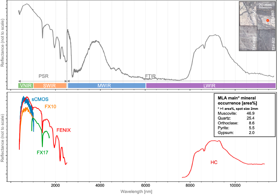 Соответствующий спектральный анализ показан на рис. 8, демонстрируя покрытые спектральные диапазоны каждого датчика по сравнению с измерениями спектральных точек и информацией анализа высвобождения минералов для одного пятна образца. Все отображаемые спектры были получены из одной и той же пространственной позиции. Различия в форме спектра в основном обусловлены разным пространственным размером пикселя каждого датчика и небольшими пространственными отклонениями положения съемки во время измерений в точке спектрометра. Благодаря извлечению информации о анализе высвобождения минералов для каждой позиции и размера пятна, минеральная интерпретация наблюдаемых спектральных характеристик может быть подтверждена и проверена.