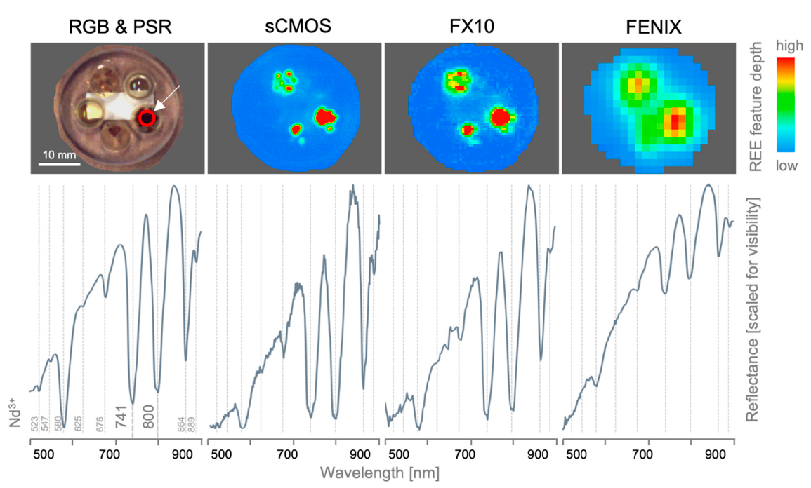 Чтобы продемонстрировать влияние пространственного и спектрального разрешения камер, а также чувствительности, анализируется набор мелкозернистых минералов, содержащих РЗЭ, с использованием всех камер, охватывающих VNIR. Высокое содержание РЗЭ спектрально выражается рядом Nd3+ - характеристик поглощения (рис. 9, слева внизу, позиции поглощения, подтвержденные Turner [41]). Глубина самых выдающихся поглощений при 741 нм и 800 нм можно использовать для создания карт содержания РЗЭ для каждой камеры (Рис. 9, верхний ряд). Влияние пространственного разрешения очевидно, с очень подробными картами, полученными из sCMOS, разрешающими даже самые мелкие зерна вплоть до сильно смешанных пикселей FENIX, где несколько маленьких зерен слиты в один более крупный объект. Спектры самого большого минерального зерна были извлечены для каждой камеры в одной и той же позиции и сравнены со спектром проверки, полученным с помощью PSR (рис. 9, нижний ряд). Система sCMOS с самой высокой спектральной чувствительностью и разрешением (сравните таблицу 1) обеспечивает точный спектр, разрешающий даже мелкие детали. Помимо сниженного отношения сигнал / шум спектр не содержит артефактов. Более низкое спектральное разрешение FX10 приводит к потере спектральных деталей, однако интенсивность видимых спектральных характеристик сохраняется. Спектральные артефакты, рядом с 680 нм, усложняют надежный анализ мелких объектов. Из-за большого размера пространственного пикселя и результирующего увеличения спектрального микширования спектр FENIX показывает пониженную глубину видимых элементов РЗЭ при сходной общей интенсивности отражения. Тем не менее, отношение сигнал/шум и спектральное разрешение достаточно высоки, чтобы обеспечить четкий спектр, отображающий еще меньшие характеристики.