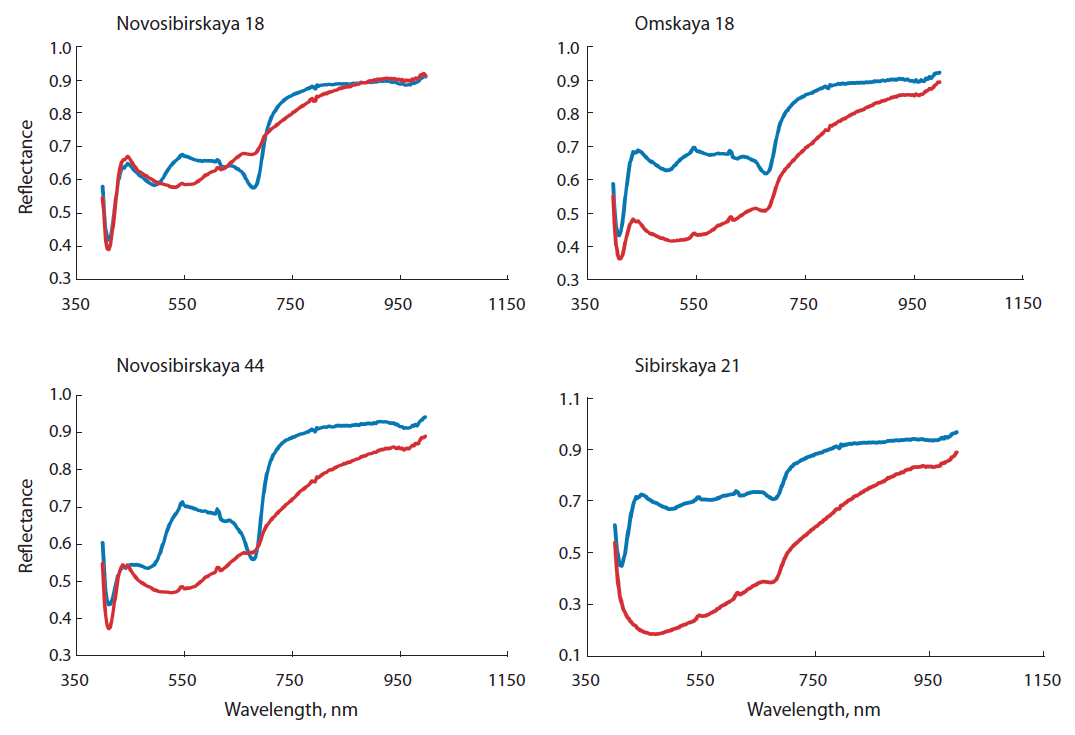 Анализ спектральных кривых, полученных для проростков разных сортов пшеницы, показал, что отражательные характеристики здоровых проростков пшеницы и инфицированных возбудителем обыкновенной корневой гнили злаков отличаются в исследуемых частях спектра – видимой (400–700 нм) и ближней инфракрасной области (700–900 нм) (рис. 1).