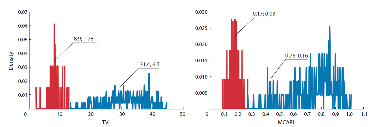 Рис. 2 Плотность распределения индексов TVI и MCARI по классам рассады (Новосибирская 18): синие столбики - здоровые растения; красные столбики - зараженные растения. Выноски указывают примерные значения и стандартные отклонения индексов.