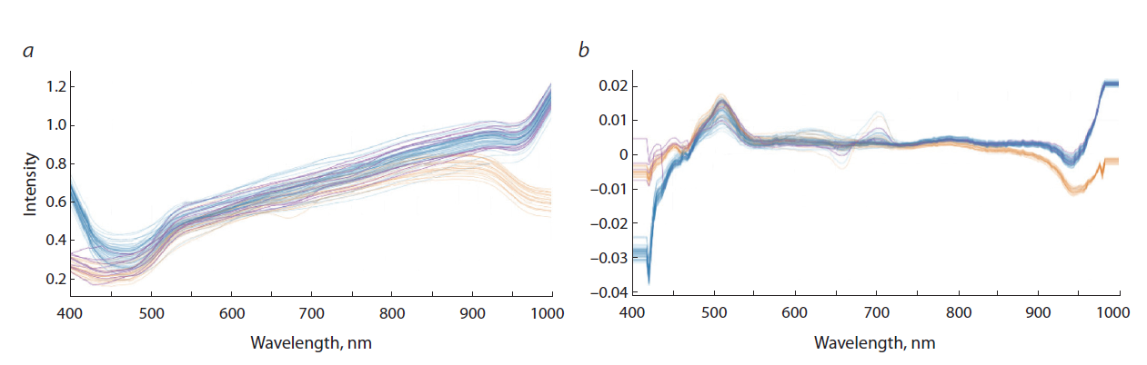 Предварительный визуальный контроль качества гиперспектральных изображений осуществлялся с помощью программы Specim IQ Studio software. Для массовой обработки изображений использовали библиотеки языка Python. Извлечение данных по интенсивности спектральных линий из выходных файлов Specim IQ в формате envi проводили с помощью пакета spectral. Сглаживание спектров было выполнено с использованием фильтра Савицкого–Голая (Savitzky, Golay, 1964), программа savgol_filter – из пакета scipy.