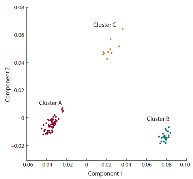 Более детальный анализ показал, что все образцы в выборке можно разделить на три группы по значению величин интенсивности спектра в этих двух областях. Эти три кластера оказались хорошо различимы на графике рассеяния для двух главных компонент, полученных при анализе производных от спектров (рис. 4). На этой диаграмме также видно, что пиксели клубней одного сорта формируют компактные облака, которые хорошо отделяются от областей, соответствующих другим генотипам картофеля.