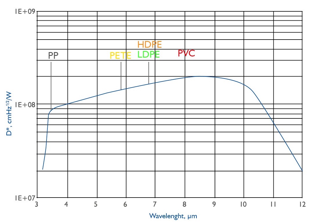 При обнаружении полос поглощения детектор VIGO System может «видеть» тип измеряемого пластика. Органические соединения, такие как полимеры, можно наблюдать более точно в MWIR диапазоне по сравнению с NIR диапазоном.
