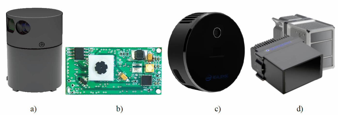 Рисунок 1. а) Brightlaser B1 LiDAR 360°, б) Brightlaser B2 плата flash твердотельного лидара, в) МЕМС-лидар, г) OPA лидар