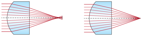 Сферическая аберрация в обычной сферической линзе (слева) по сравнению с асферической линзой (справа).