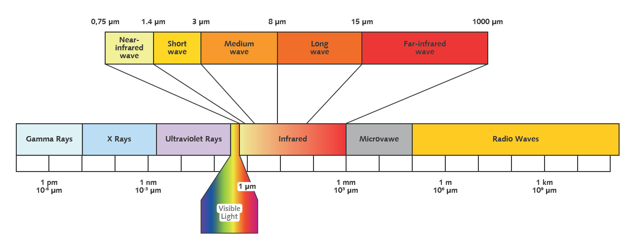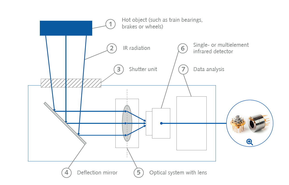 Каждый объект с температурой выше абсолютного нуля (0 Кельвина = –273,15 ° C) испускает со своей поверхности электромагнитное излучение, которое пропорционально его температуре. Часть этого излучения - инфракрасное излучение, которое можно использовать для измерения температуры объекта. Интенсивность излучения и длина волны, при которой интенсивность этого излучения имеет максимальное значение, зависят в основном от температуры объекта (закон Планка, закон смещения Вина). Оптимальный спектральный диапазон в железнодорожных системах составляет от 3,0 до 5,5 мкм.