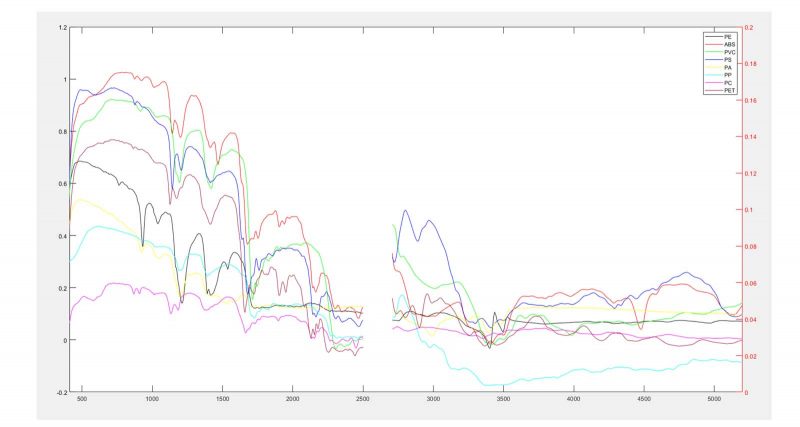 Исследования Specim включали измерение, анализ и классификацию следующих образцов пластика: полиэтилен (PE), АБС-пластик (ABS), поливинилхлорид (PVC), полистирол (PS), полиамиды (PA), полипропилен (PP), поликарбонаты (PC) и полиэтилентерефталат (PET). Это наиболее часто перерабатываемый пластик (обозначенный как на рис.1). Образцы были в основном белыми или прозрачными и измерялись в лаборатории Specim.