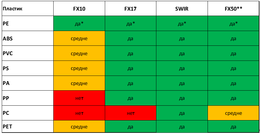 Подводя итог, можно сказать, что гиперспектральные камеры Specim FX подходят для сортировки пластмасс независимо от их окраски. В зависимости от выдвинутых требований могут использоваться разные камеры. В таблице 1 ниже приведены результаты.