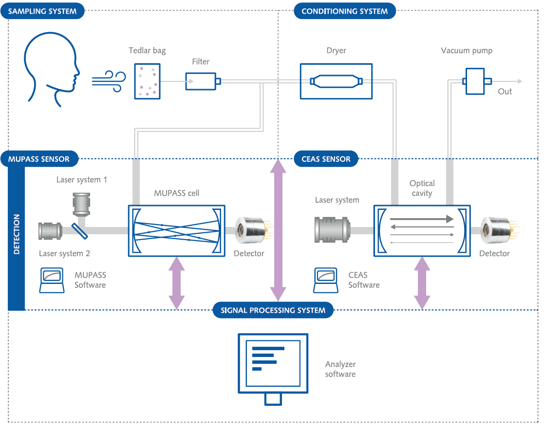 Система отбора проб собирает выдыхаемый пациентом воздух. В соответствии со стандартами ATS / ERS он может работать в режиме «on-line» или «off-line». В системе кондиционирования проба газа подготавливается для дальнейшей обработки: удаления влаги, создания отрицательного давления, обеспечения соответствующей скорости воздушного потока. Датчик CEAS обнаруживает NO (оксид азота). Он использует лазер QCL (λ = 5,26 мкм) и высокочувствительный модуль ИК-обнаружения VIGO с пределом обнаружения приблизительно 30 частей на миллиард. Для обнаружения CH4 (метана) и CO (окиси углерода) использовался двухспектральный датчик MUPASS с одной многопроходной ячейкой. Для метана (λ = 2,2536 мкм) предел обнаружения составил 100 частей на миллиард, а для монооксида углерода (λ = 2,336 мкм) – 400 частей на миллиард. Сигналы от датчиков регистрируются блоком интерфейса и направляются в систему обработки сигналов (компьютер и программное обеспечение), где полученные результаты интегрируются, визуализируются и анализируются.