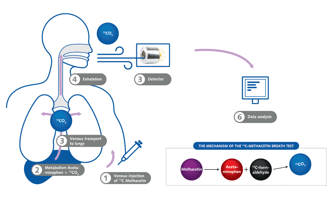 Тест динамической функции печени основан на метаболизме 13C-метацетина. Метацетин метаболизируется печеночно-специфической системой цитохрома P450 1A2 в ацетаминофен и 13С-формальдегид, который затем за несколько быстрых ферментативных шагов превращается в 13CO2, который, в свою очередь, транспортируется через кровоток в легкие и выдыхается. Индивидуальную функцию печени можно оценить путем непрерывного измерения отношения 13CO2 / 12CO2.