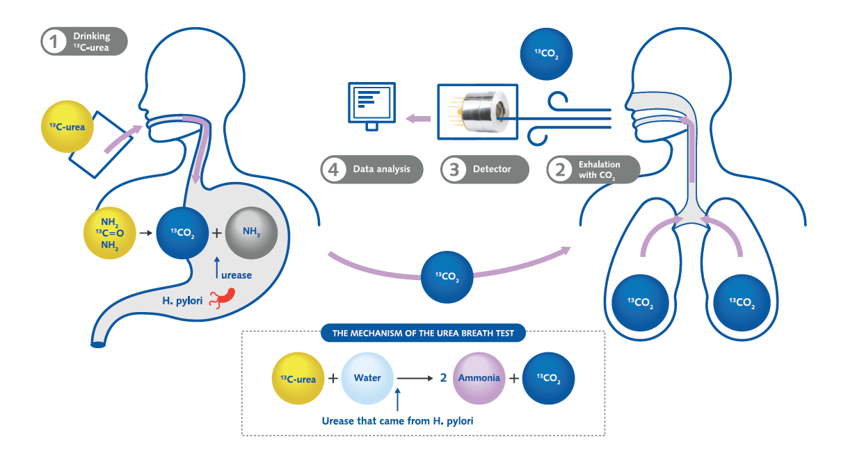 Он основан на способности helicobacter pylori преобразовывать мочевину в аммиак и диоксид углерода. Пациенты проглатывают мочевину, меченную нерадиоактивным углеродом-13. Через 10-30 минут обнаружение изотопно-меченого диоксида углерода 13CO2 в выдыхаемом воздухе указывает на расщепление мочевины. Это указывает на уреазу – фермент, который helicobacter pylori использует для метаболизма мочевины, если он присутствует в желудке, то, следовательно, присутствуют бактерии helicobacter pylori.