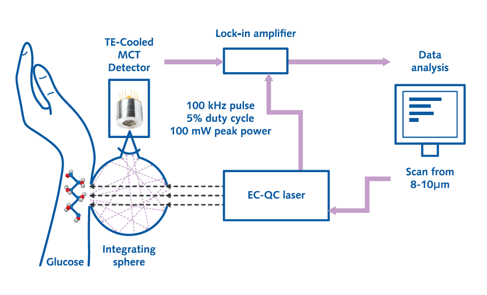 Излучение импульсного лазера QC с диапазоном настройки от 8 до 10 мкм фокусируется на коже человека. Затем свет поглощается молекулами глюкозы и обратно рассеивается слоем дермы кожи. Расходящийся свет, выходящий из кожи, улавливается миниатюрной интегрирующей сферой и обнаруживается охлаждаемым детектором LWIR VIGO TE.
