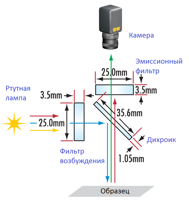 Типичная установка флуоресцентного микроскопа. Система фильтров состоит из трех типов фильтров: фильтра возбуждения, дихроичного фильтра и фильтра эмиссии.