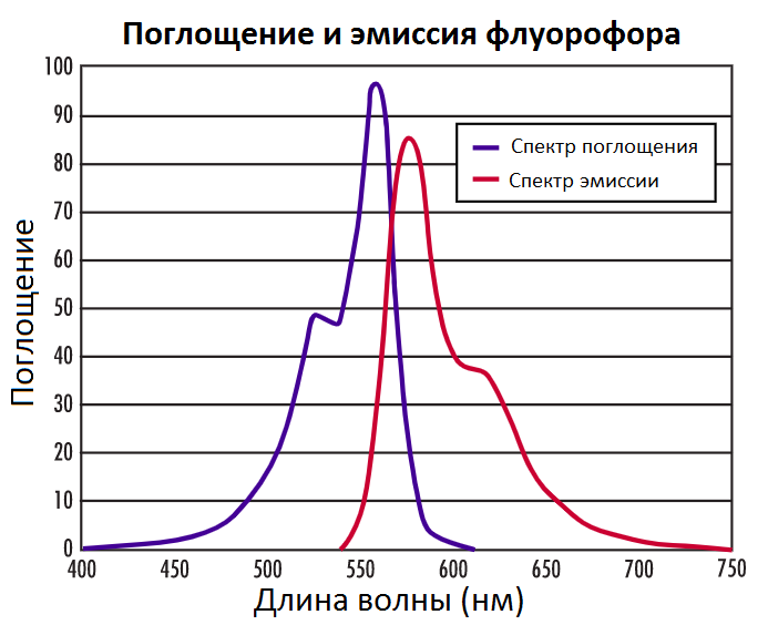 На рисунке показан типичный профиль возбуждения и эмиссии. Профили поглощения и излучения имеют общие длины волн, что является одной из причин, по которой необходимы высококачественные фильтры с высокой пропускаемостью, узкой полосой, высокой оптической плотностью и резкими переходами между пропусканием и поглощением. Использование фильтров низкого качества может в конечном итоге повредить образец, или дорогостоящие датчики.