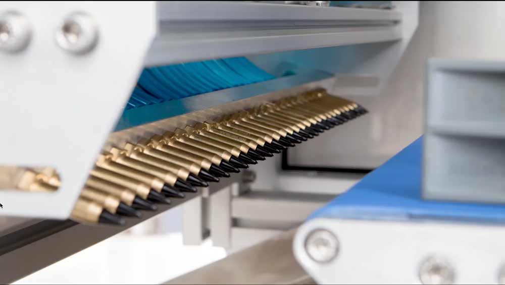Конвейерная лента заканчивается шкивом, где основная масса материала падает через край, чтобы в процессе удалить дефектные частицы и остальные виды загрязнений. На основе результатов оценки изображения система управляет 32 высокоточными соплами, которые выбивают обнаруженные объекты, не соответствующие критериям, с траектории, в контейнер для брака. С другой стороны, недефектные объекты попадают в сборный контейнер и могут подвергаться дальнейшей переработке.