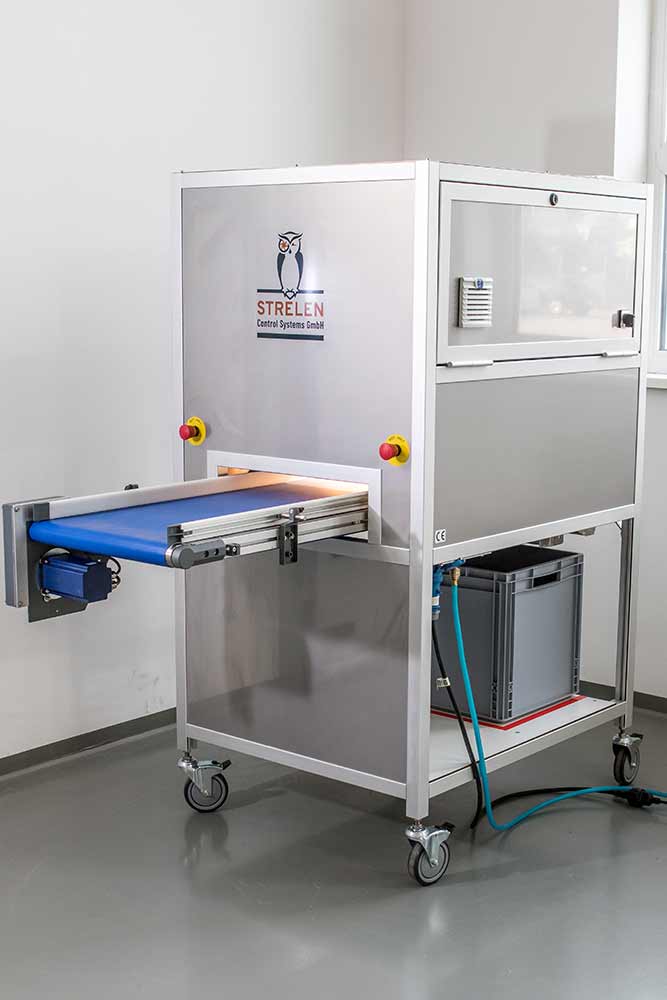 Safe-Ident Sort – это название машины, разработанной Strelen Control Systems для сортировки орехов, которая используется с осени 2020 года. Она работает с конвейерной лентой, по которой несортированный материал транспортируется со скоростью 150 мм в секунду под гиперспектральной камерой Specim FX10. Эта камера непрерывно записывает изображения и пересылает их в программу обработки изображений на основе Halcon, специально разработанной для этого приложения.