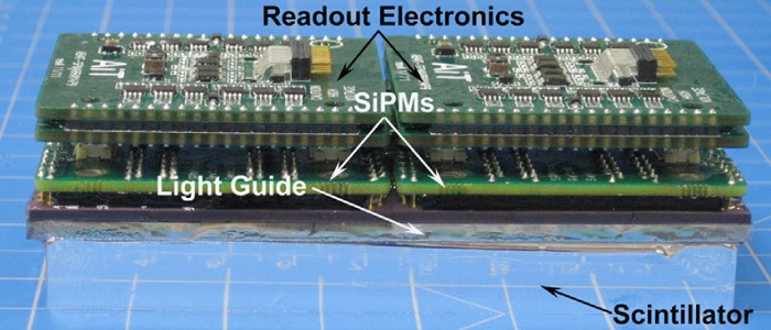 Новые детекторные модули используют матрицу из 26х58 LYSO элементов с размерами 1.5х1.5х10 мм3 (шаг = 1,57 мм), разделенных ESR отражателями (производство компании Proteus, Ноксвилл, США). Таким образом активная область детектора составляет 41,2 х 91,5 мм2, что больше активной области других детекторных модулей на основе SiФЭУ. Матрица LYSO элементов соединяется с двумя фотоприемниками фирмы SensL ArraySL-4p9 (SensL Technologies, Корк, Ирландия). Эти фотоприемники состоят из матриц SiФЭУ ArraySL-4 расположенных в формате 3х3. Каждая матрица ArraySL-4 имеет 16 (4х4) пикселей с размерами 3.05х3.05 мм2 (4774 микроячейки). Их коэффициент усиления при комнатной температуре и нормальных условиях составляет 2,4 х 106. Таким образом, каждый фотоприемник ArraySL-4p9s имеет 3х3х4х4 = 144 независимых каналов данных; общий размер чувствительной области составляет 48х48 мм2. Для оптического соединения двух матриц SiФЭУ с матрицей сцинтилляторов используется акрил толщиной 2 мм. Световод необходим для того, чтобы распространить свет от сцинтилляторов для перекрытия оптического зазора между двумя матрицами SiФЭУ. Таким образом, сцинтилляционный свет, излучаемый элементами, расположенными над стыком двух матриц SiФЭУ, передается в активную область матриц. Световод также распространяет сцинтилляционный свет среди пикселей массивов SiФЭУ, что облегчает вычисление положения события в массиве сцинтиллятора. На рисунке 1 показан законченный детектор.