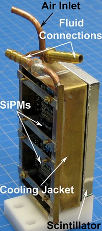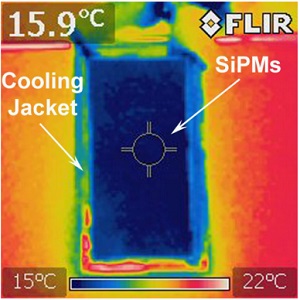 Как и в случае большинства твердотельных устройств, производительность SiФЭУ зависит от температуры. Снижение их рабочей температуры сокращает температурные шумы (темновой ток) и увеличивает коэффициент усиления. Коэффициент усиления увеличивается из-за снижения напряжения пробоя при низких температурах, при условии постоянного напряжения смещения. Температура детектора может быть снижена, если его поместить в охлаждающий кожух. В частности, для защиты матрицы SiФЭУ ArraySL-4p9 и считывающей электроники использовалась прямоугольная медная пластина толщиной 4.75 мм. К внешней части корпуса припаян канал, состоящий из медной трубки с размерами 2.38 мм х 2.38 мм. К каждому концу канала припаяны разъемы с выводами. По каналу циркулирует раствор 50% холодной дистиллированной воды и 50% этиленгликоля, который в свою очередь охлаждает медную оболочку. Медь соединяется с гранями матриц SiФЭУ, тем самым охлаждая их. Жидкость охлаждается мини охладителем производства Peter Huber Kältemaschinenbau GmbH (Оффенбург, Германия). Это устройство может охладить циркулирующую жидкость до температуры -10°С и имеет мощность охлаждения 300 Вт при температуре 14°С. Такой мощности достаточно для одновременного охлаждения до 250 модулей до температуры 14°С (каждый модуль поглощает примерно 1,2 Вт мощности). Для конвекционного охлаждения модуля в устройство подается воздух посредством трубки с внутренним диаметром 3.175 мм, которая имеет охлаждающий кожух. Эта трубка имеет 7 небольших отверстий, которые позволяют воздуху дойти до считывающей электроники. Воздух перемещается по трубке с внутренним диаметром 4.76 мм подсоединенной к медицинскому воздушному рециркулятору в исследовательской зоне. Воздух предварительно охлаждается пропусканием охлаждающей жидкости через теплообменник в контакте с трубкой подачи воздуха. Все материалы используемые для охладителя имеют высокую теплопроводность и немагнитные характеристики. На рисунке 2 показан ПЭТ детектор с охладителем. Система охлаждения способна производить равномерное охлаждение поверхности матрицы SiФЭУ ArraySL-4p9 (вариативность температуры < ~0.6°C). На рисунке 3 показано инфракрасное изображение передней поверхности охлажденного модуля без сцинтиллятора. Обратите внимание, что видимые нагретые участки в рубашке охлаждения вызваны отражением окружающего света от меди и несоответствием излучательной способности меди и настройки коэффициента излучения в ИК-камере, которая была настроена на излучательную способность кремния.